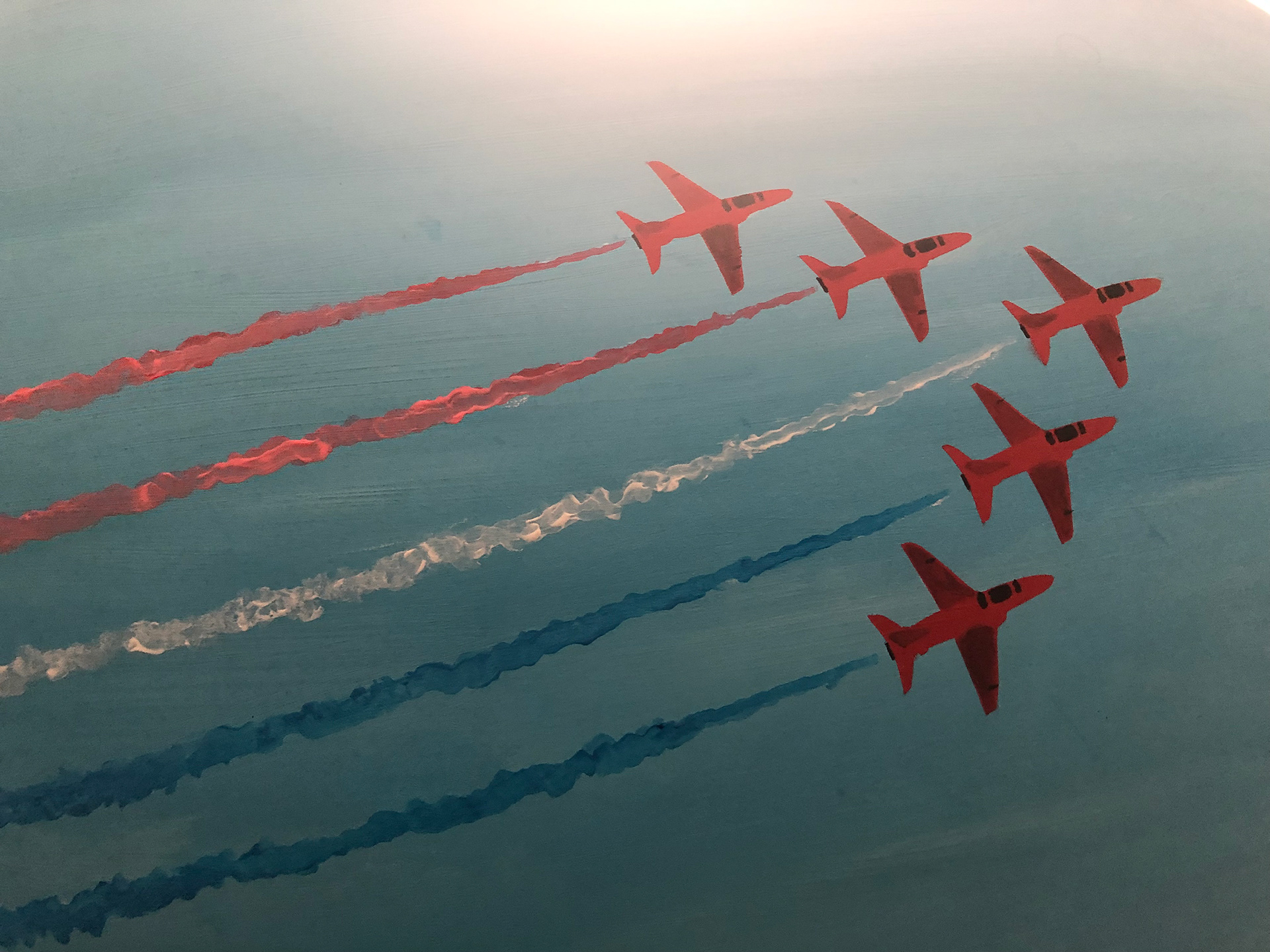 Spraying the fireworks on using a template I cut out of card. Lots of masking!